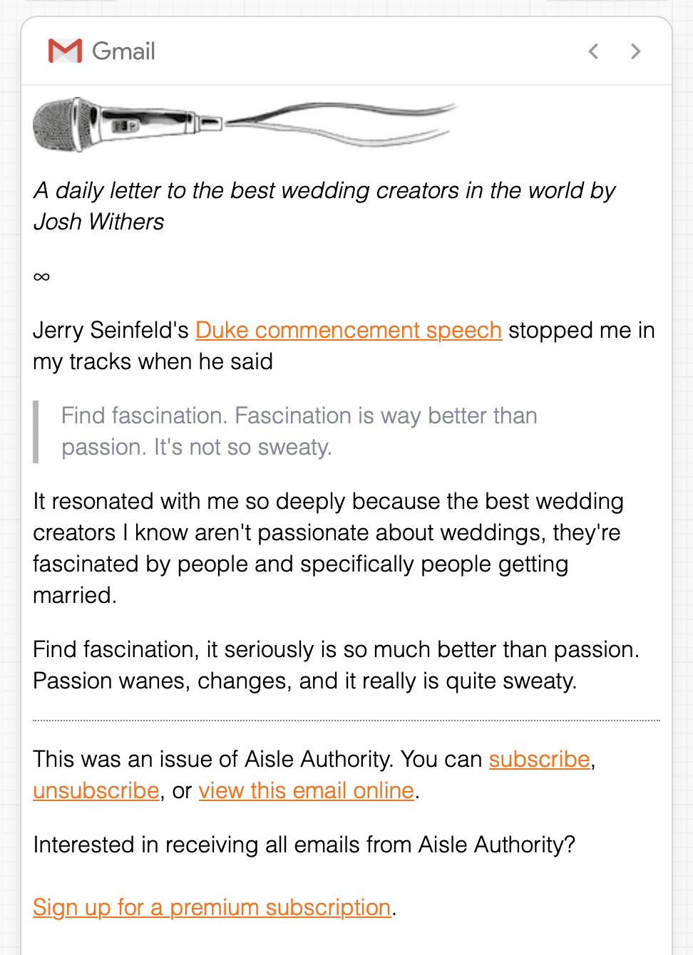 • Apart from actually doing the work couples pay me to do, like making their weddings and elopements, some of the proudest professional work I'm doing these days is in Aisle Authority, my daily letter to the world's best wedding creators. If you create weddings for a living like I do, it's the kind of daily business encouragement I wanted to receive but no-one was making, so I wrote one.