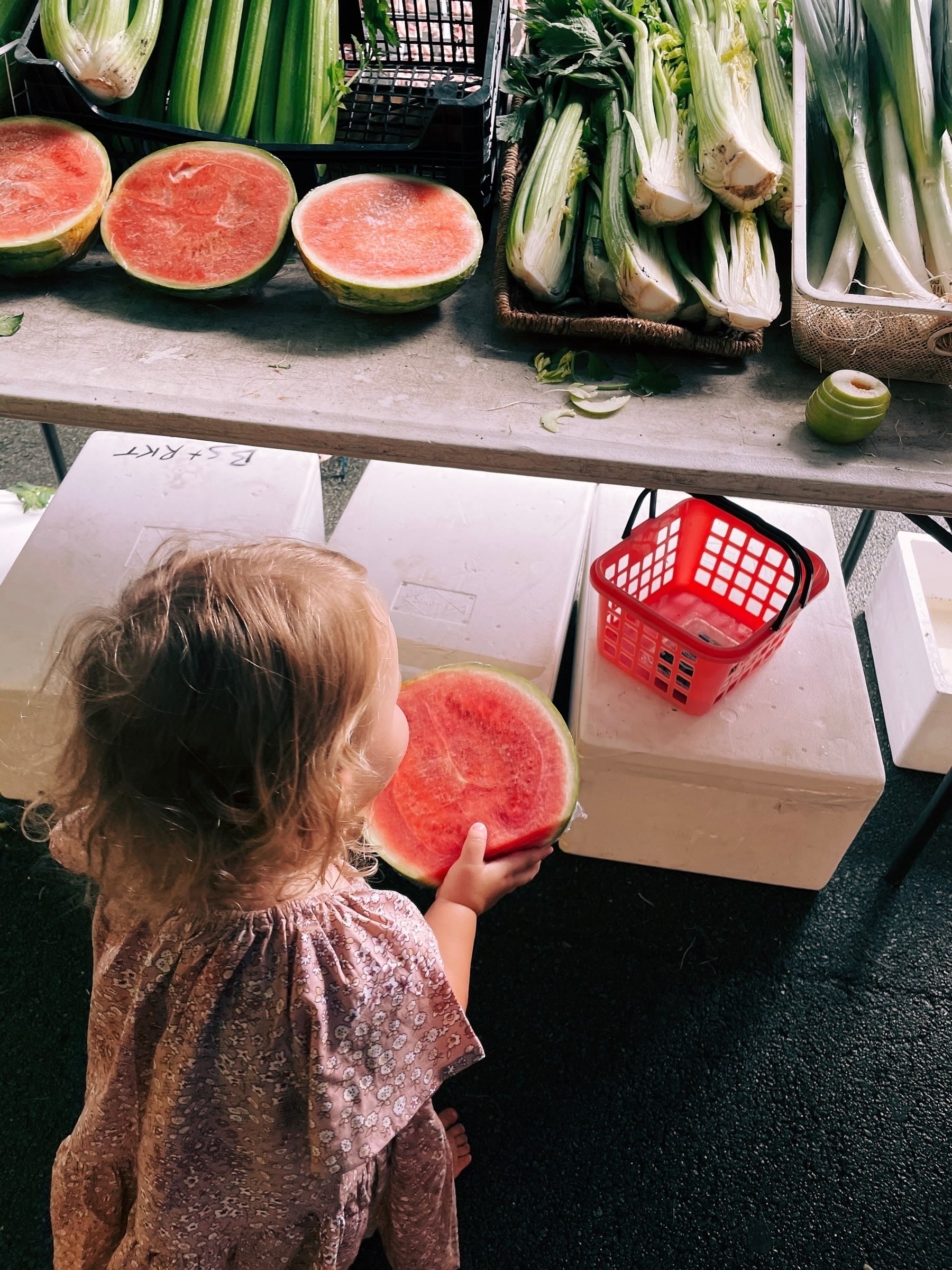 • I’m at the markets talking to a friend and Luna walks off, treks across the whole market, to go to the stall she knows has watermelon. She gets a basket, puts a watermelon in it, and a carrot, and goes to the cashier.