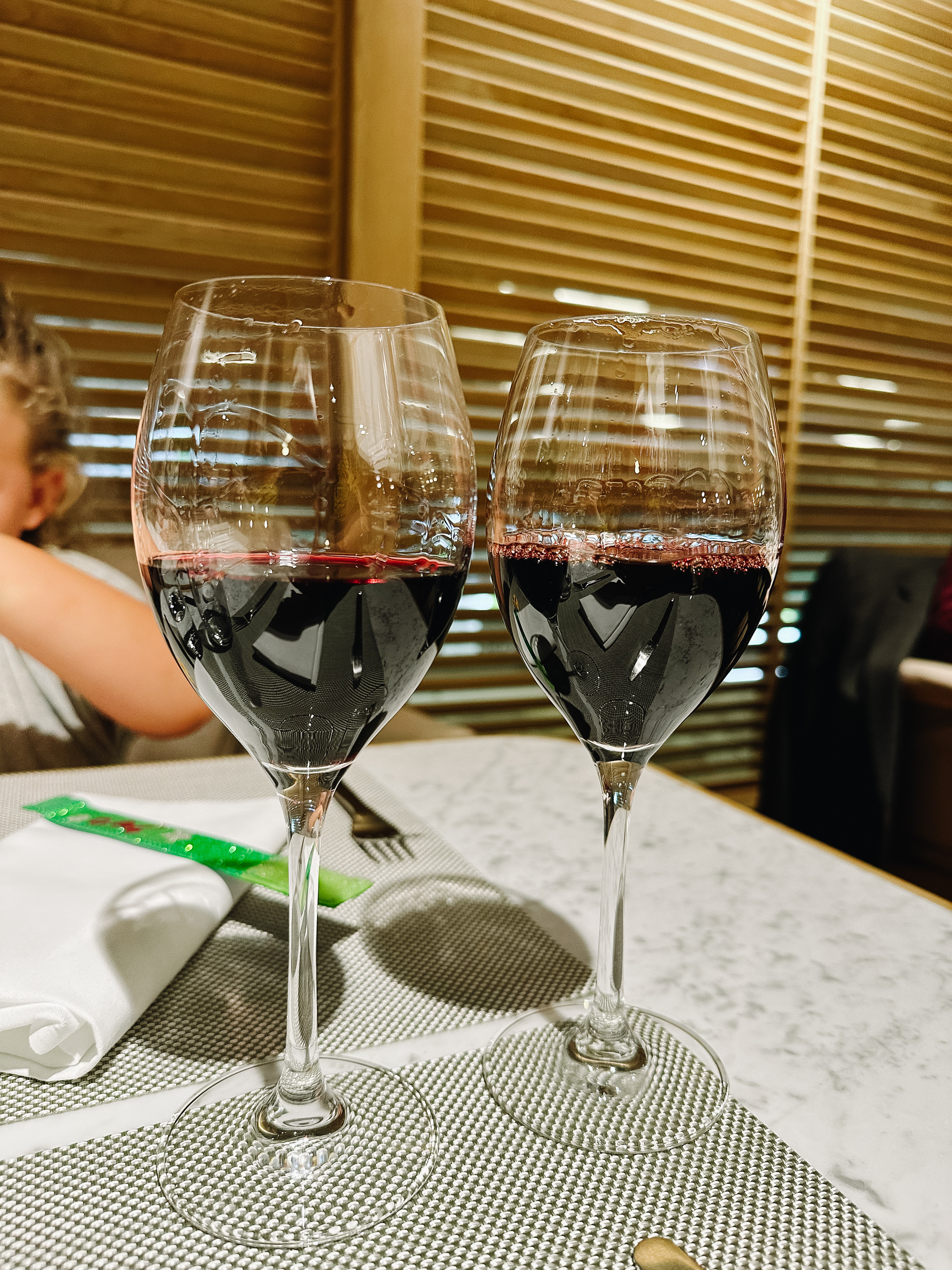 I’m in the Qantas Singapore Lounge and the waiter poured me a glass of Shiraz, a 2020 from South Australia, on the left.