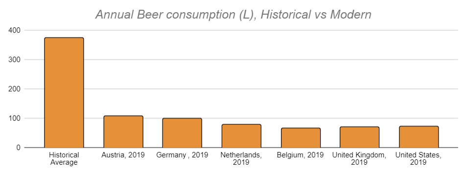 The English, said Sir John Fortescue (c. 1470), "drink no water, unless at certain times upon religious score, or by way of doing penance.", looking at reconstructions of beer consumption from the middle ages to the pre-industrial era this was only a slight exaggeration. When estimating consumption from the amount of beer provided to soldiers, convicts, and workers or reconstructing consumption from tax revenues on beer we see that the average person consumed about a liter of beer a day, this is around four times as much as consumption in modern beer-drinking countries.